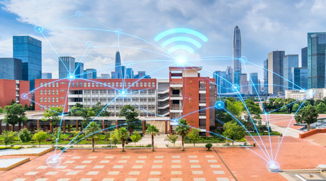 以云计算、移动互联网、物联网、人工智能等技术为基础,通过主流组网方式,将各类校园设备与互联网连接,实现对校园内设备、环境、人员的智能化识别、监控与管理,创新校园管理模式,打造安全、稳定、环保、节能的校园环境。