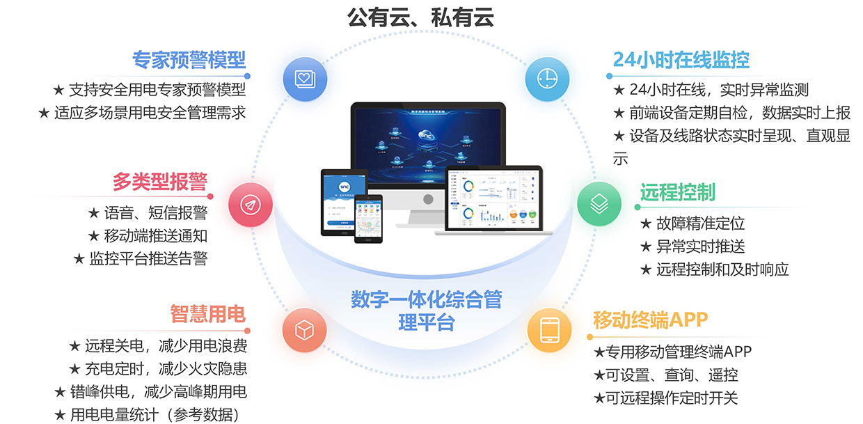 7×24 小时实时监测用电安全与设备状态,支持语音、短信、APP 多渠道告警。