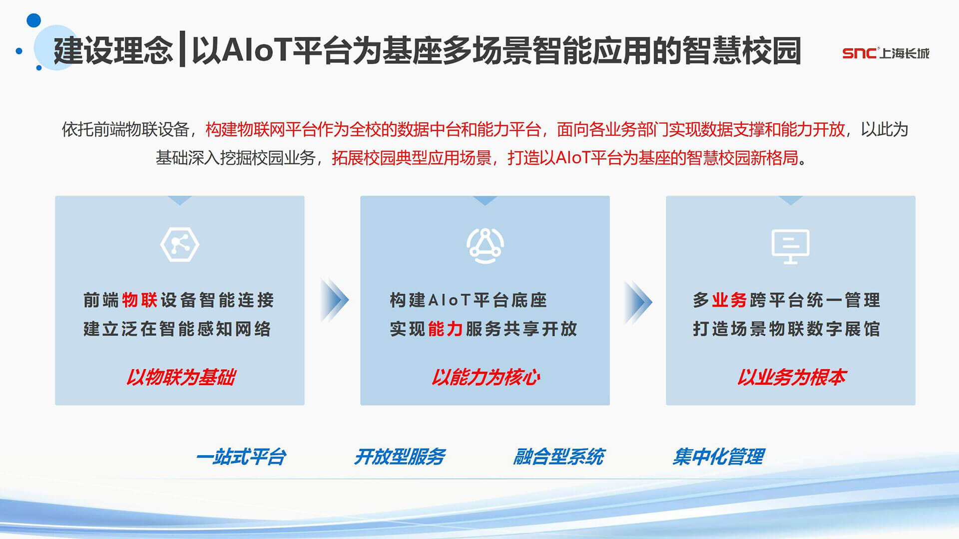 针对这些痛点,我们提出了以AIoT为核心的智慧校园建设理念。首先是万物互联,通过物联网技术,我们将校园内的人、设备、环境全面连接起来,实现全域感知。